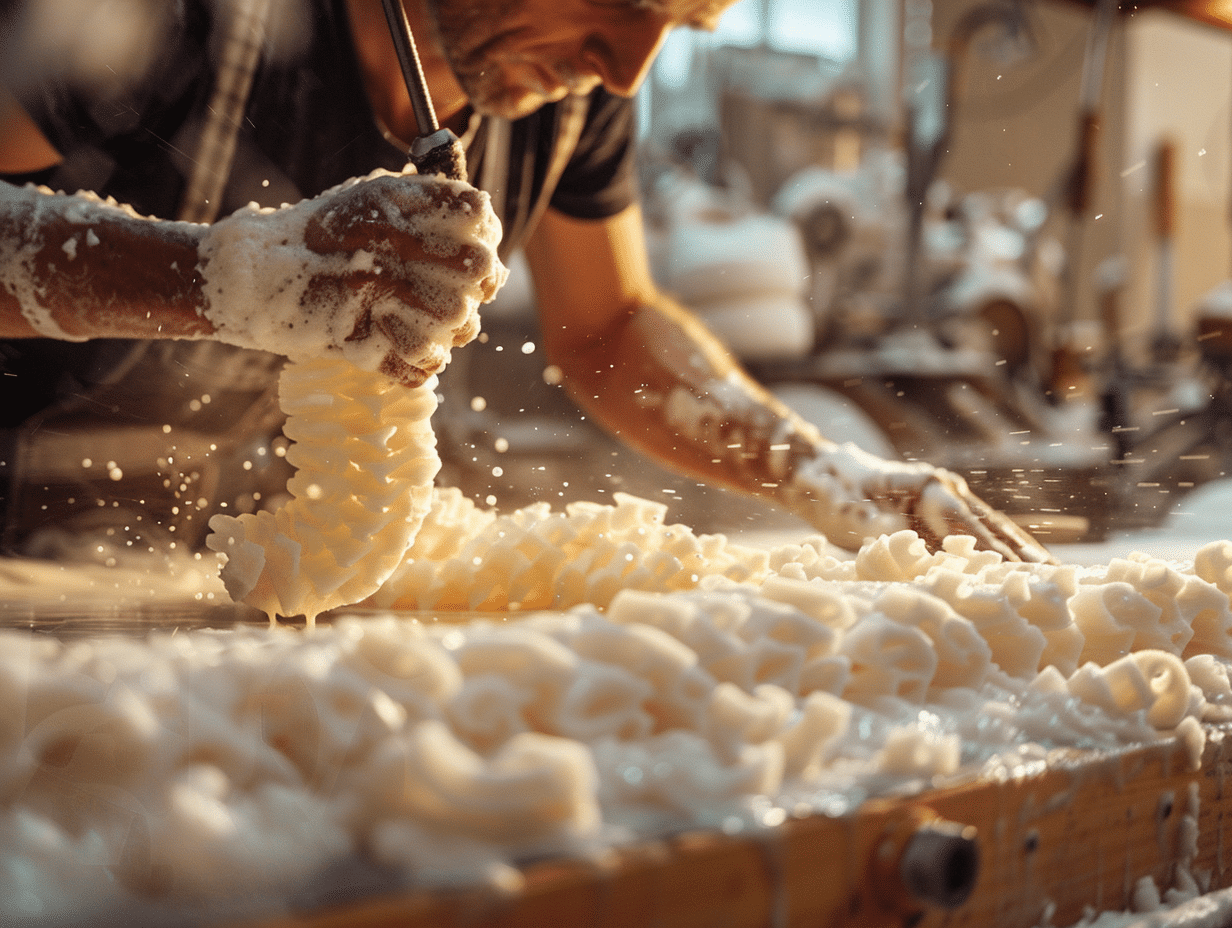La transformation des mousses se déroule en plusieurs étapes clés. Le mélange des ingrédients est préparé dans des proportions précises pour garantir une réaction chimique adéquate. L’agent gonflant est ajouté, entraînant la formation de bulles dans le mélange. Le matériau est alors coulé dans des moules spécifiques pour obtenir des formes personnalisées.